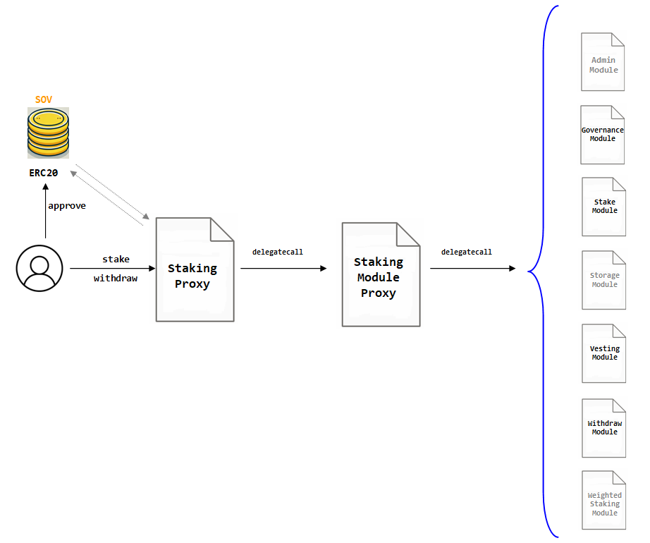 After such transaction the user can address the execution of `stake` to the `Staking` contract. The `stake` function implies the internal execution of several `delegatecall`s to the `StakingModuleProxy` and several of logic modules.
